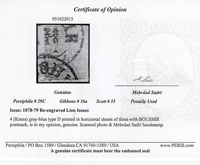 Iran 1878 Lion Scott # 35 Gray Blue Used SCV $175 Certified
