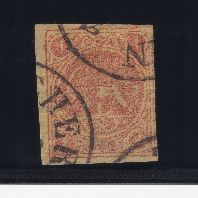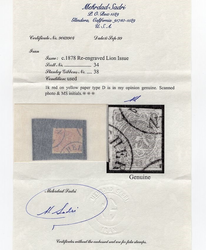 1kr red on yellow paper Type D Scott # 34 postally used Scott value without coast certification $175.00, certification by Mr. Mehrdad Sadri.