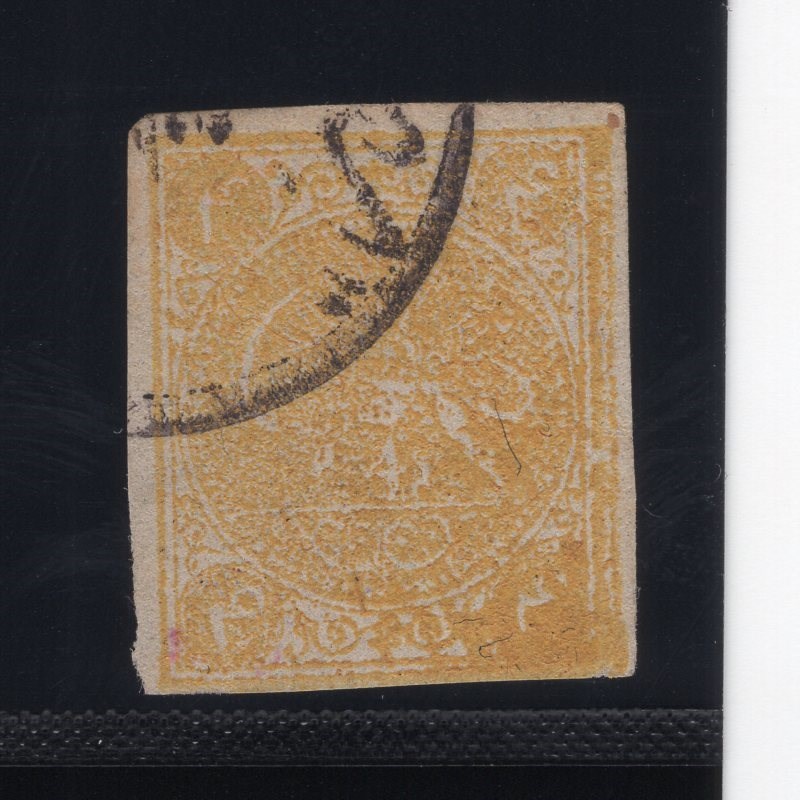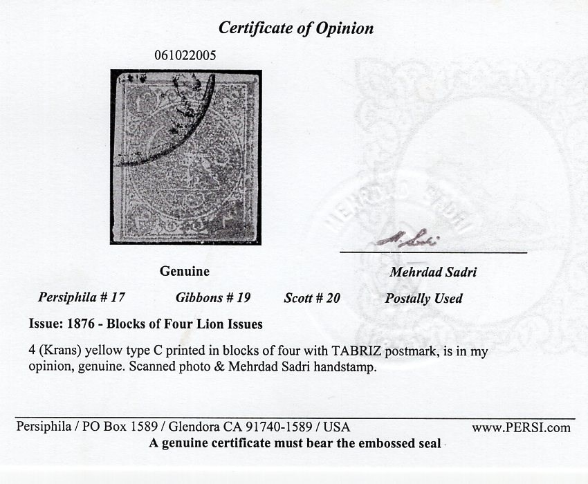 4kr yellow Type C Scott # 20 postally used with pin hole Tabriz postmark Scott value without coast certification $300.00, Card certification by Mr. Mehrdad Sadri.