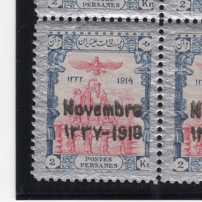 Marginal block four 2kr Ahmad Shah coronation overprinted for the end WWI Scott # 610 mint never hinged Scott value for four single hinged $200.00, Signed by Mr. Mehrdad Sadri.