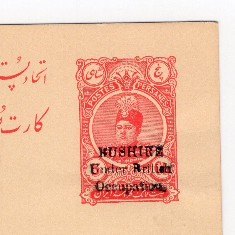 5ch red Ahmad Shah postal card overprinted Bushire under British occupation Persiphila # PC 34 mint in good condition Persi value $1500.00