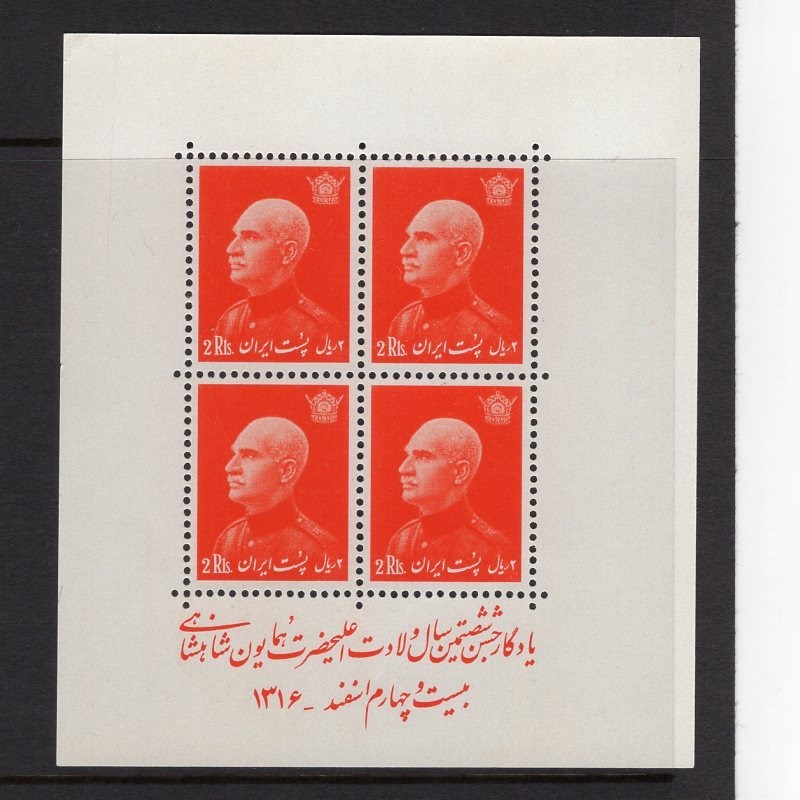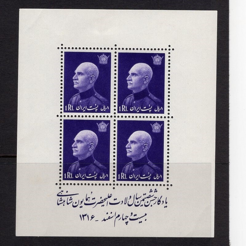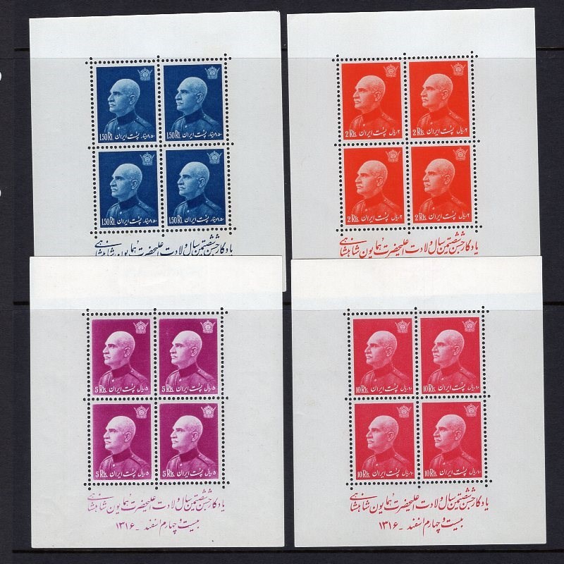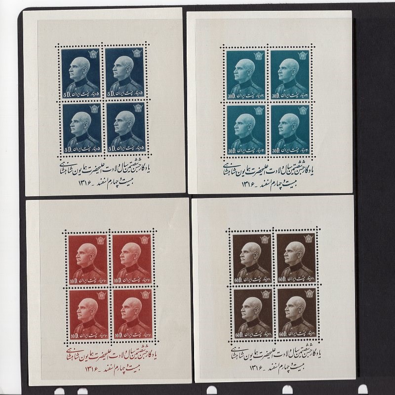 Complete set 10 in sheets of four Reza Shah 60th birthday Persiphila # 934AS-943AS mint all stamps never hinged some lightly hinged on the top margin Persi value for MNH $1200.00