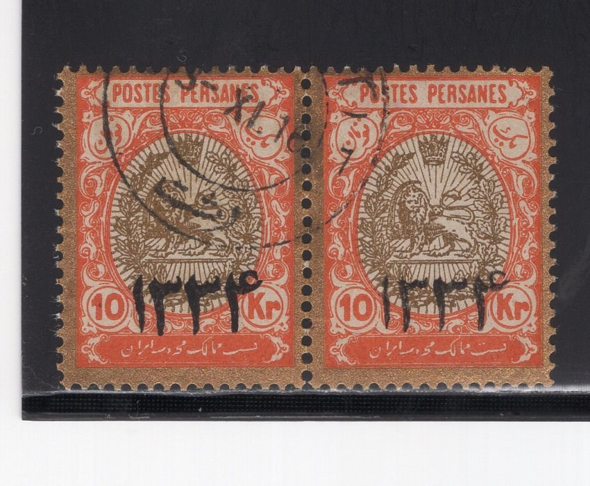 Pair 10kr coat of arms overprinted 1334 Scott # 583 postally used Scott value for two single $70.00, Signed by Mr. Mehrdad Sadri.