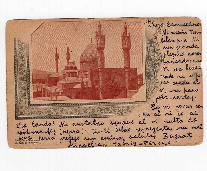 6ch on 5ch red picture postal card showing mosque in Kerman in brown color mailed from Tehran to Arad with damage on the side and age discoloring and round corners.