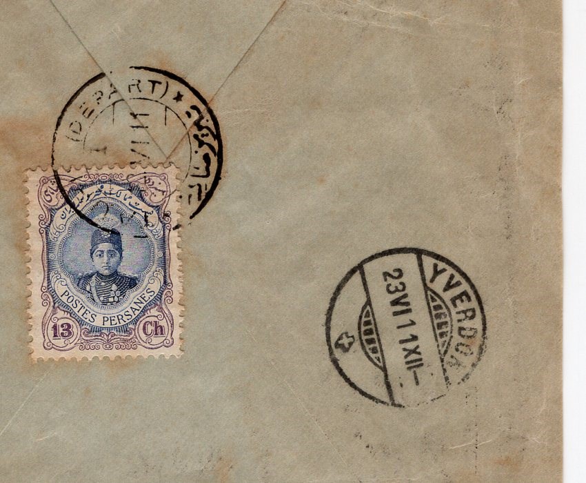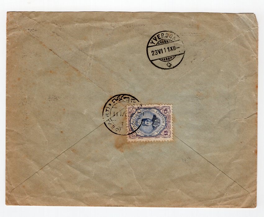 Single franking of 13ch Ahmad Shah short portrait Scott # 490 on cover with corner fold and age discoloring from Tauris without Officiel overprint to Yvrdon.