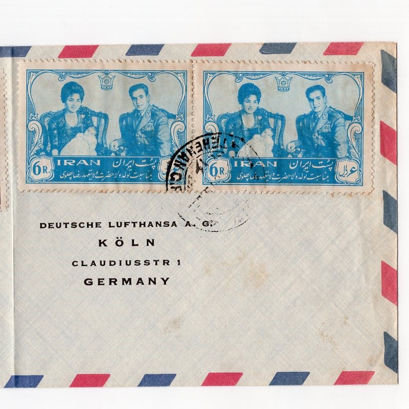 Scott # 1169 pair, 1187 pair on cachet cover folded in the middle from Tehran to Koln on Boeing jet.