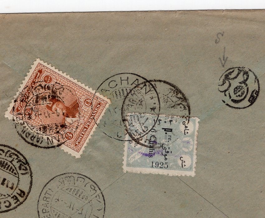 Scott # 669, 689 on 9ch rate from Kachan to Recht via Tehran with fancy " C " for sandooq mailbox marking.
