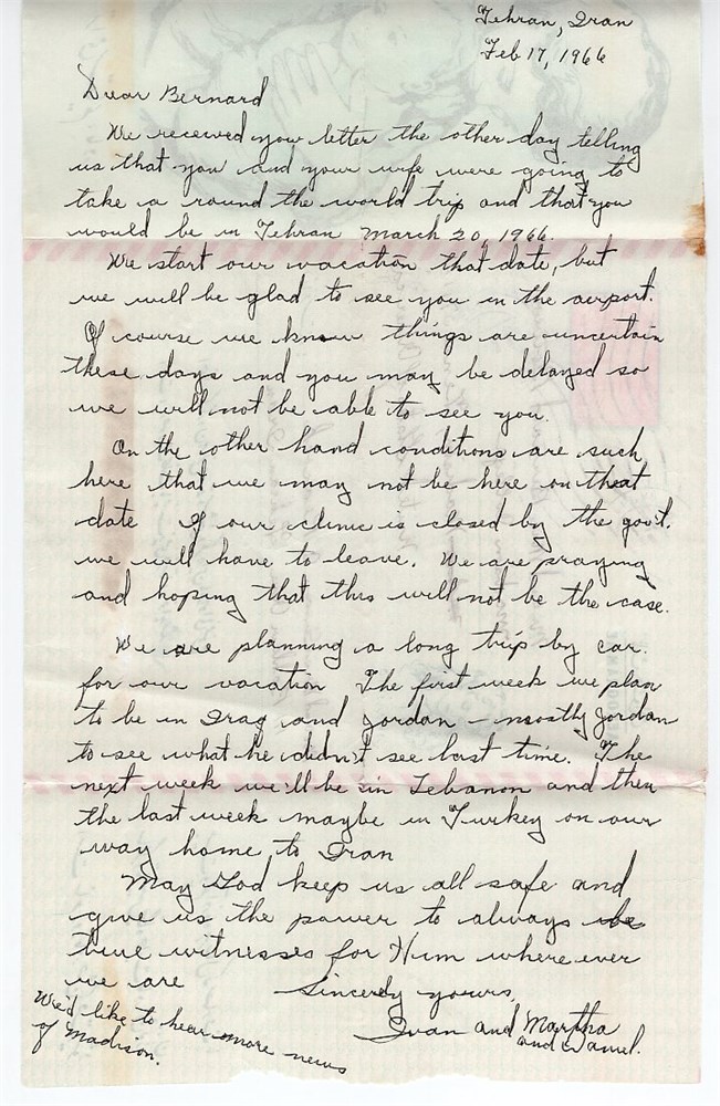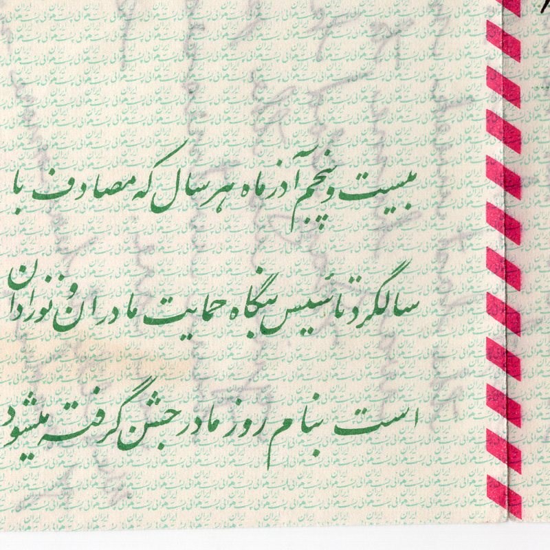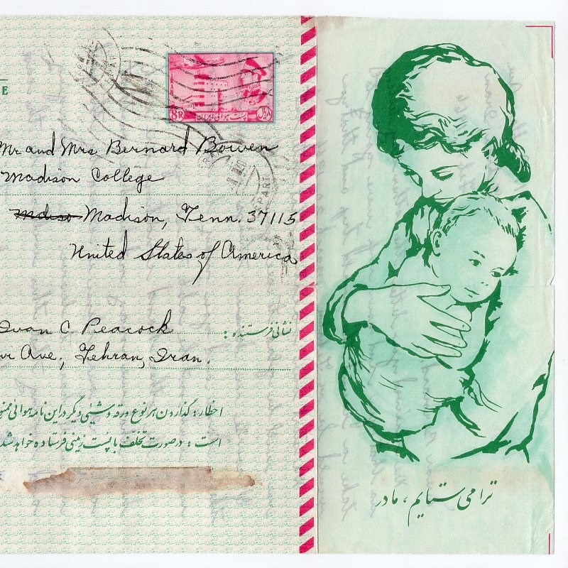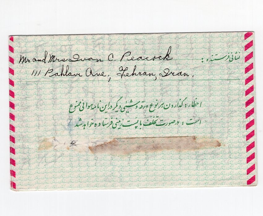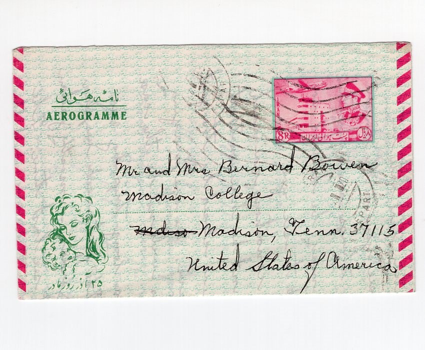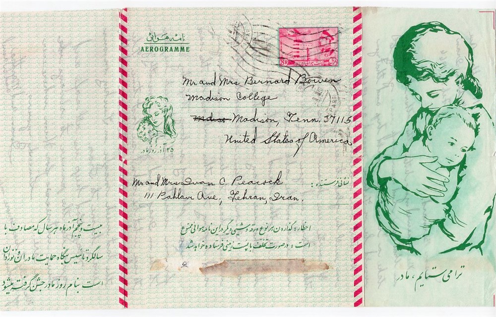 8 Rials Mother day aerogramme with a tear on the back due to rough opening from Tehran to Madison.