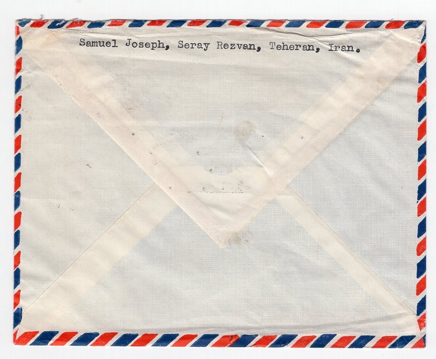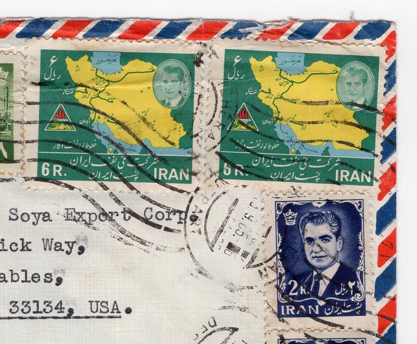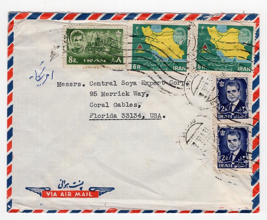 Scott # 1322x2 with crease, 1214x2, 1217 on an airmail cover with fold from Tehran to Coral Cables.