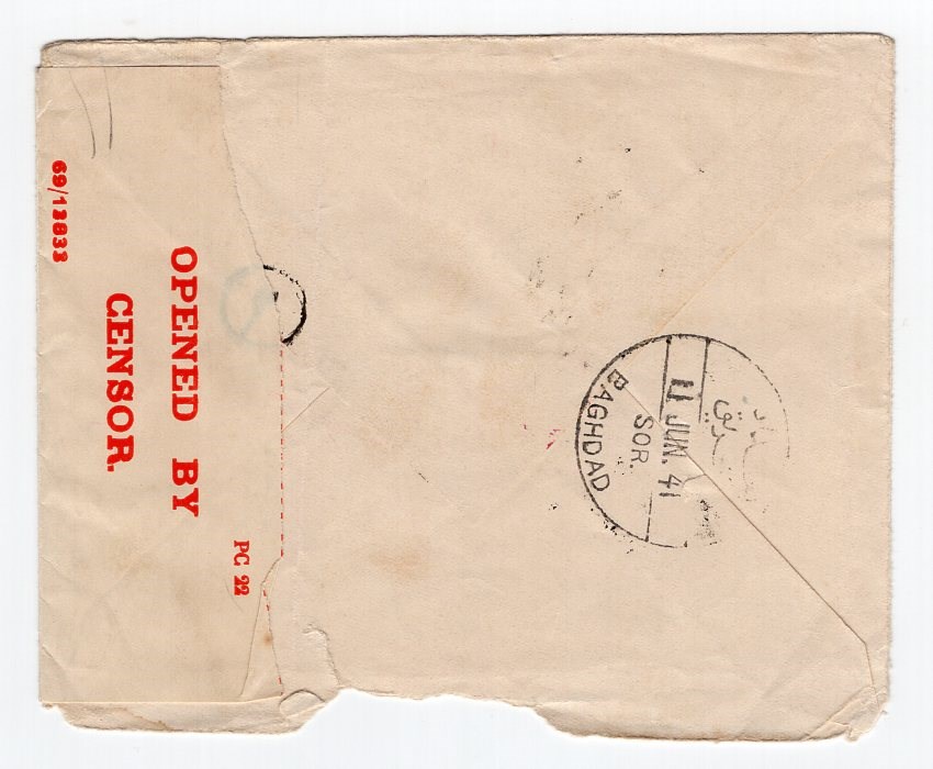 Scott # 863, 865 on damaged cover from Tehran to Jerusalem via Baghdad with red Iraqi censor and pre printed censor label.