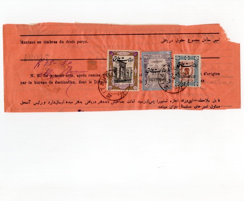 10ch, 3kr and 1 Toman Ahmad Shah coronation overprinted Colis Postaux Scott # Q25, Q30, Q32 on parcel delivery permit from Tauris to Ardebil.