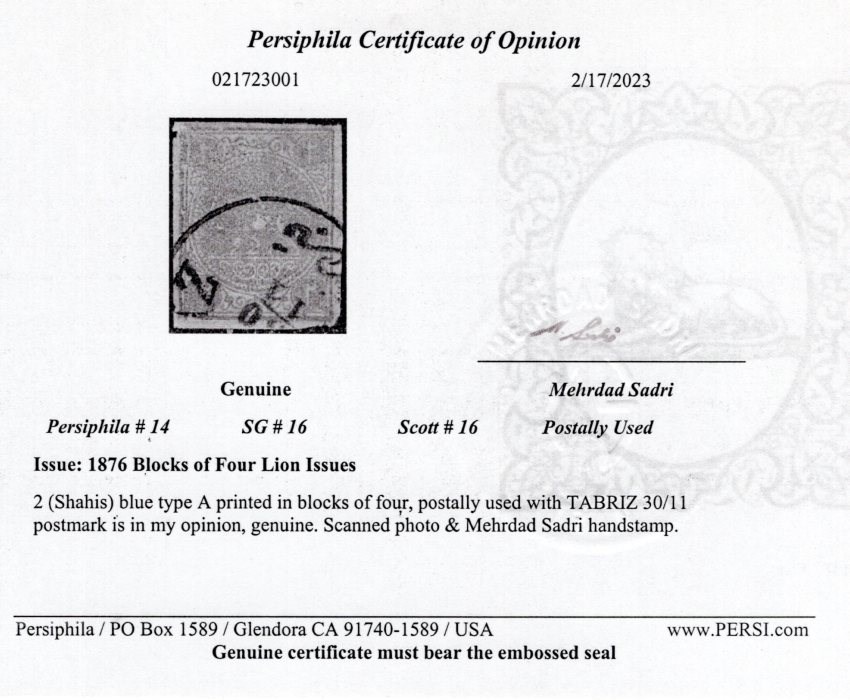 Damaged copy of 2ch blue Type A Scott # 16 hard to find postally used Scott value $750.00, Card Certification by Mr. Mehrdad Sadri.