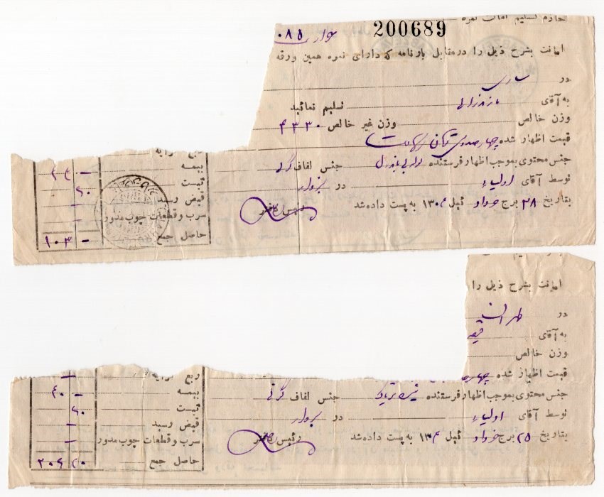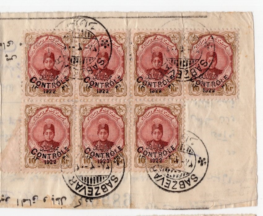 Two large part parcel delivery from Sabzevar to Chahroud and Tehran with strip 9 of 20kr, pair, strip3, and block 7 of 10kr controle 1922.