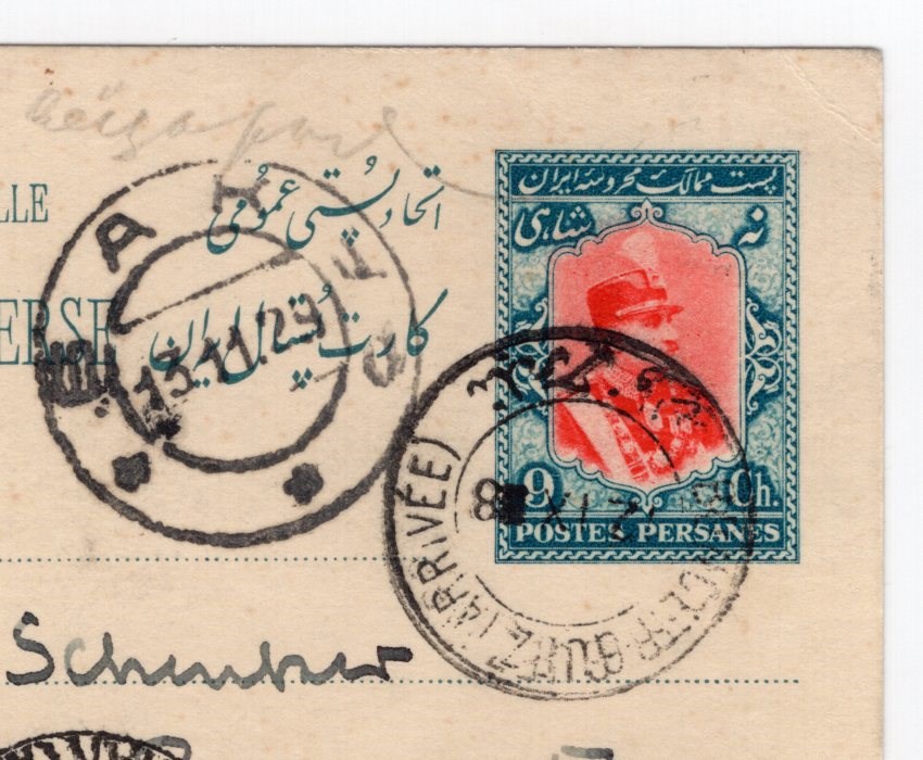 9ch Reza Shah coronation postal card Persiphila # PC48 mailed from Bender Guez to Aorur via Tehran and Baku with corner crease Persi value from $150.00