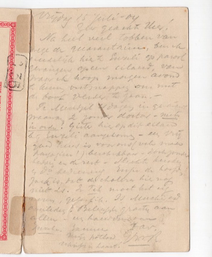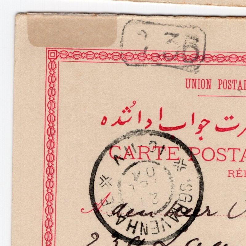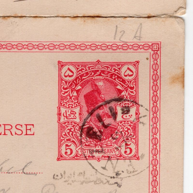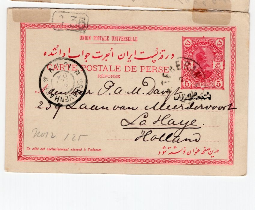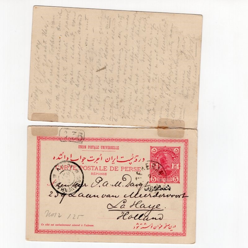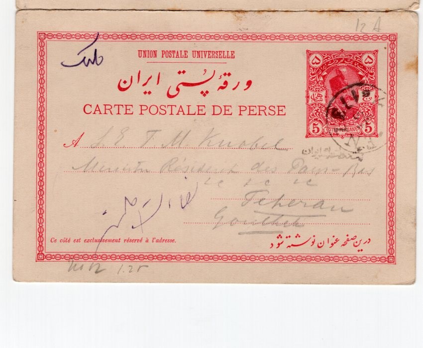 Message card mailed from Enzeli to Gholhk address to Dutch Amassador.
