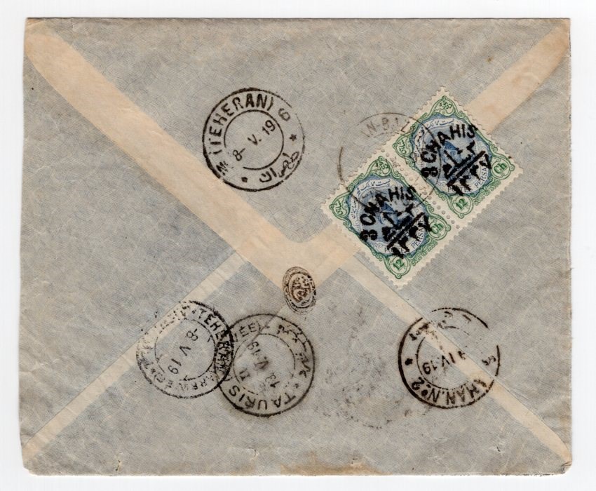 Pair 3ch 1337 on 12ch Ahmad Shah Scott # 607 on cover from Isfahan Bazar to Tauris via Isfahan and Tehran with British army Dunsterforace # 101 censor.