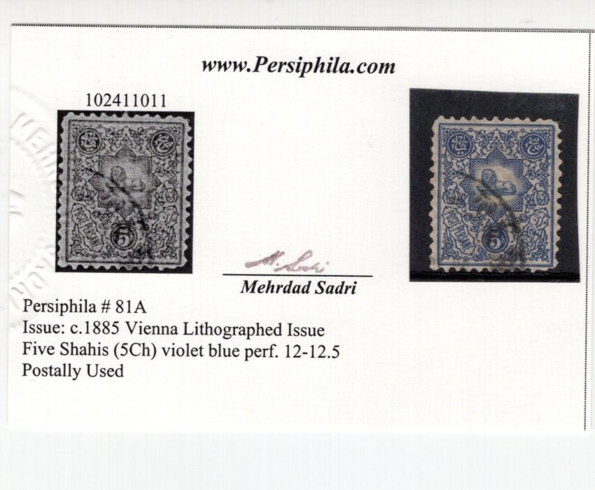 5ch violet blue perf 12-12.5 Scott # 59Aa postally used Scott value $75.00, Mini certified by Mr. Mehrdad Sadri.