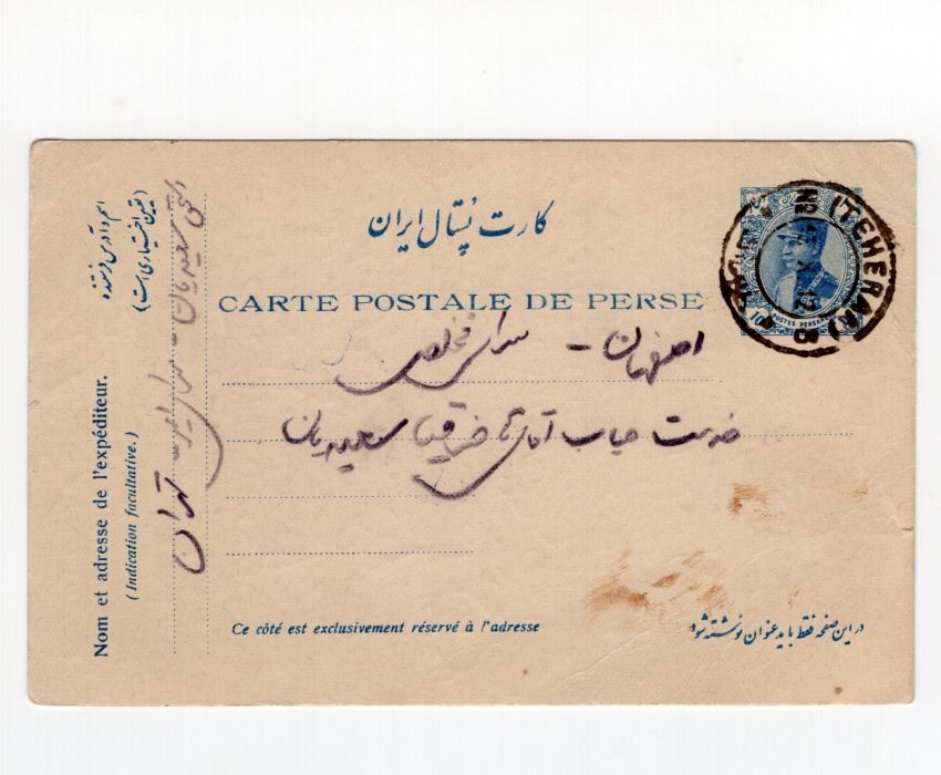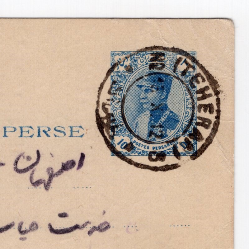 10 Dinar Reza Shah postal card with some yellowish spots and corner crease mailed from Tehran to Isfahan Persian written using the Hebrew alphabet.