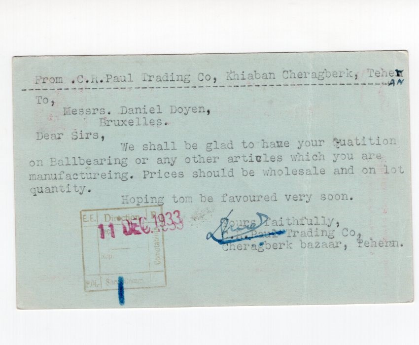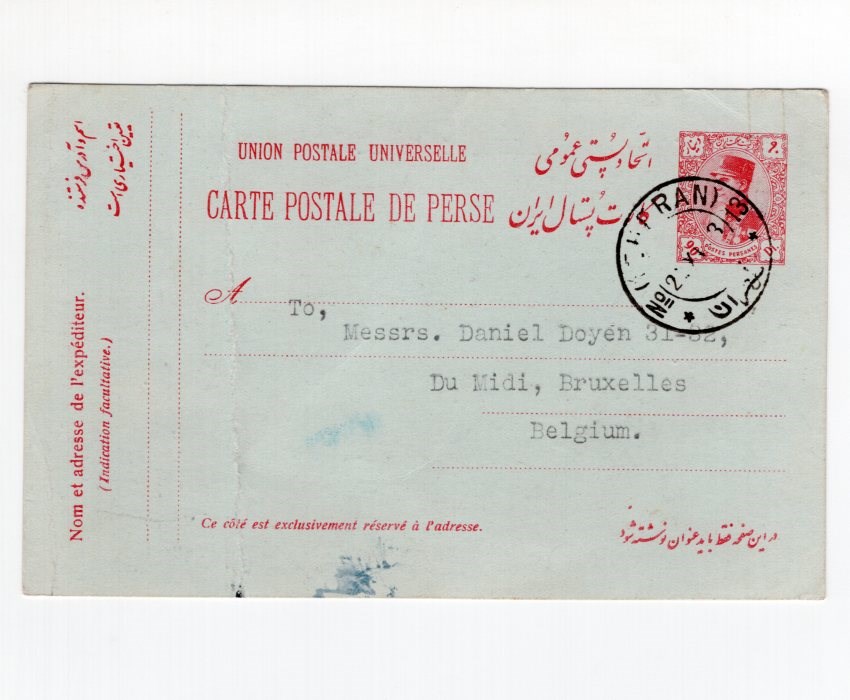 Folded on the side 90 Dianr red on light blue card Persiphila # PC52B mailed from Tehran to Brussel Persi value from $175.00