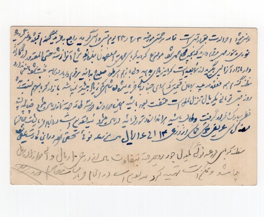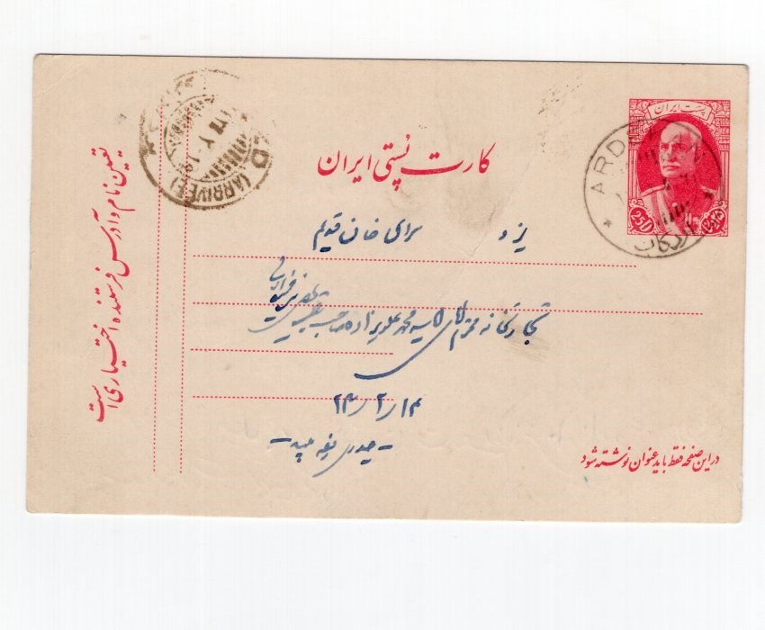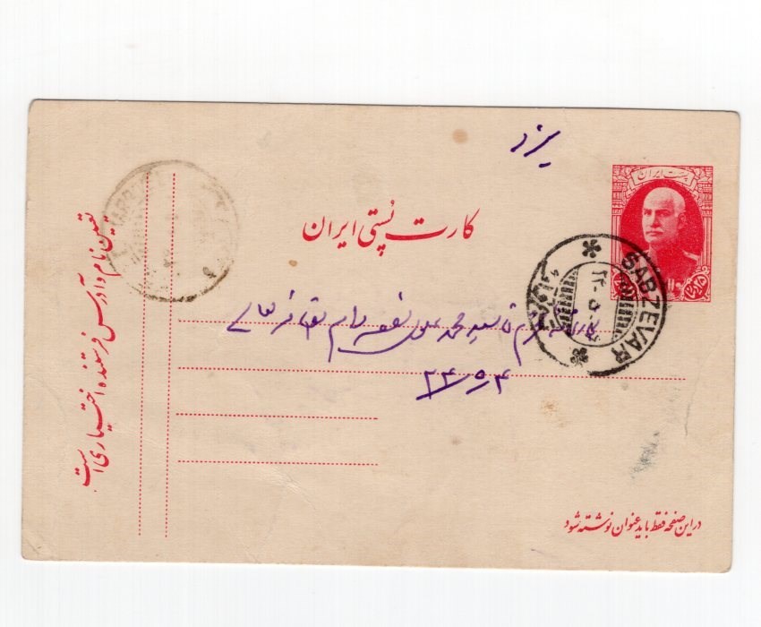 Two 25 Dinar postal card with shifted Reza Shah portrait, to the side from Ardekand and down from Sabzevar both with crease.