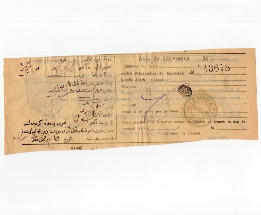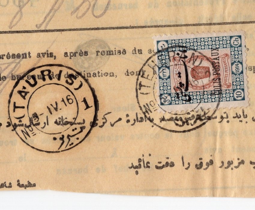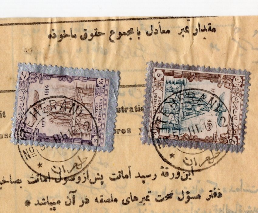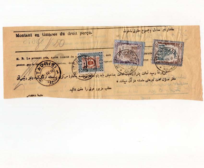 3kr, 5kr Ahmad Shah coronation and 10ch overprinted Colis Postaux Scott # 572, 573, Q25 on parcel delivery permit from Tehran to Tauris.