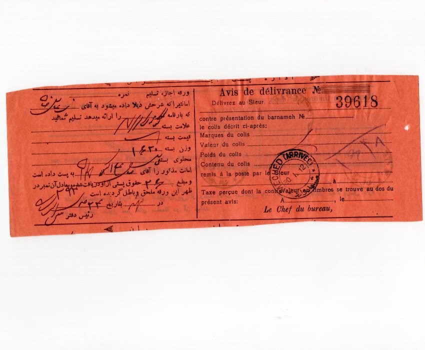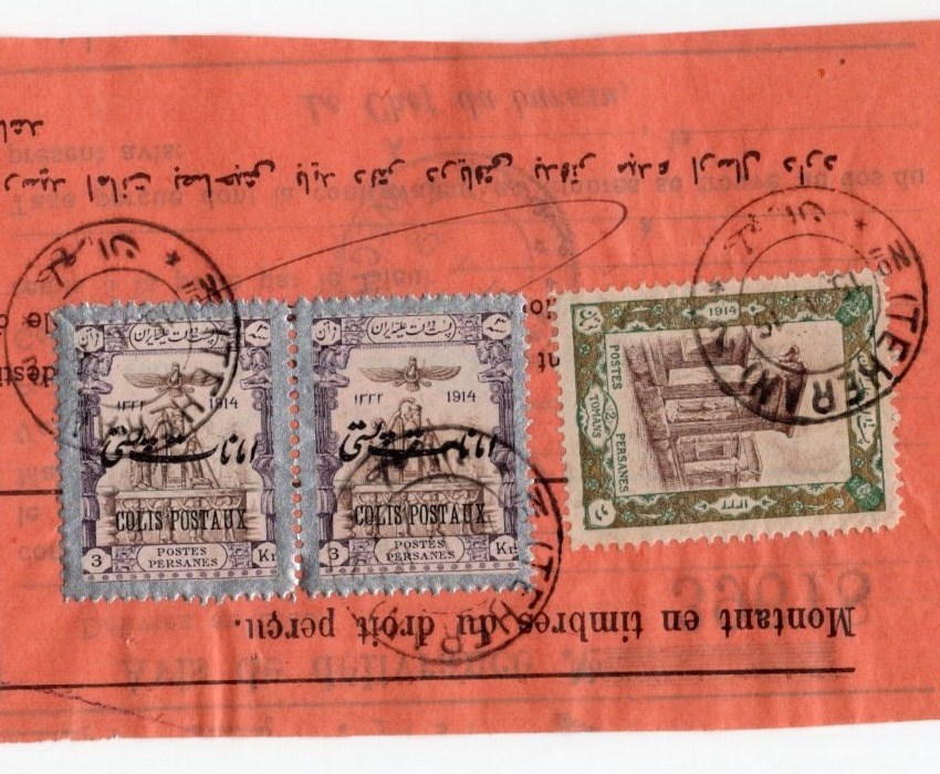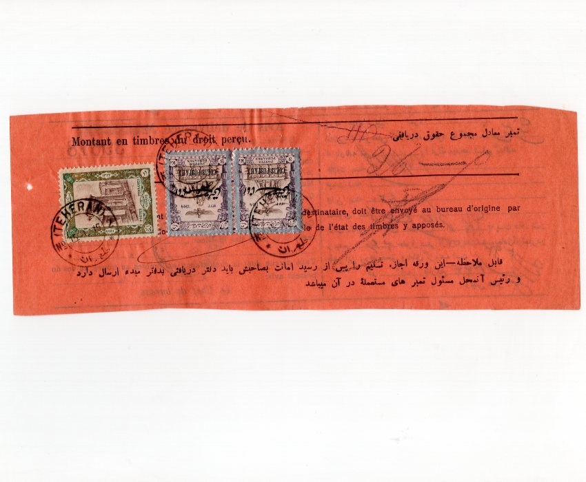 2 Tomans Ahmad Shah coronation and pair 3kr overprinted Colis Postaux Scott # 575, Q34 on parcel delivery permit from Tehran to Meched.