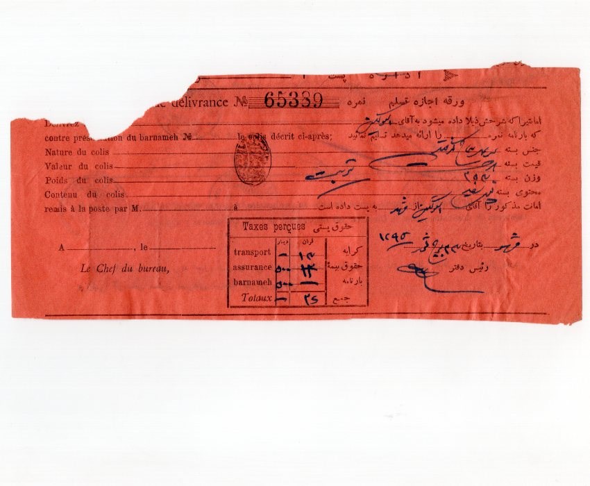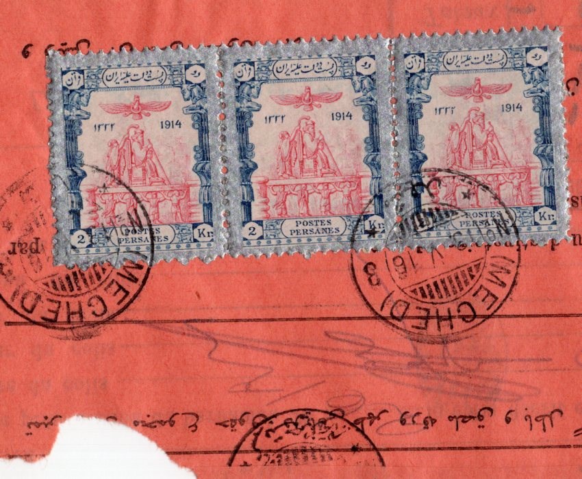 Strip 3 of 2kr and pair 1 Toman Ahmad Shah coronation Scott # 571, 574 on parcel delivery permit missing corner from Meched to Torrbet.