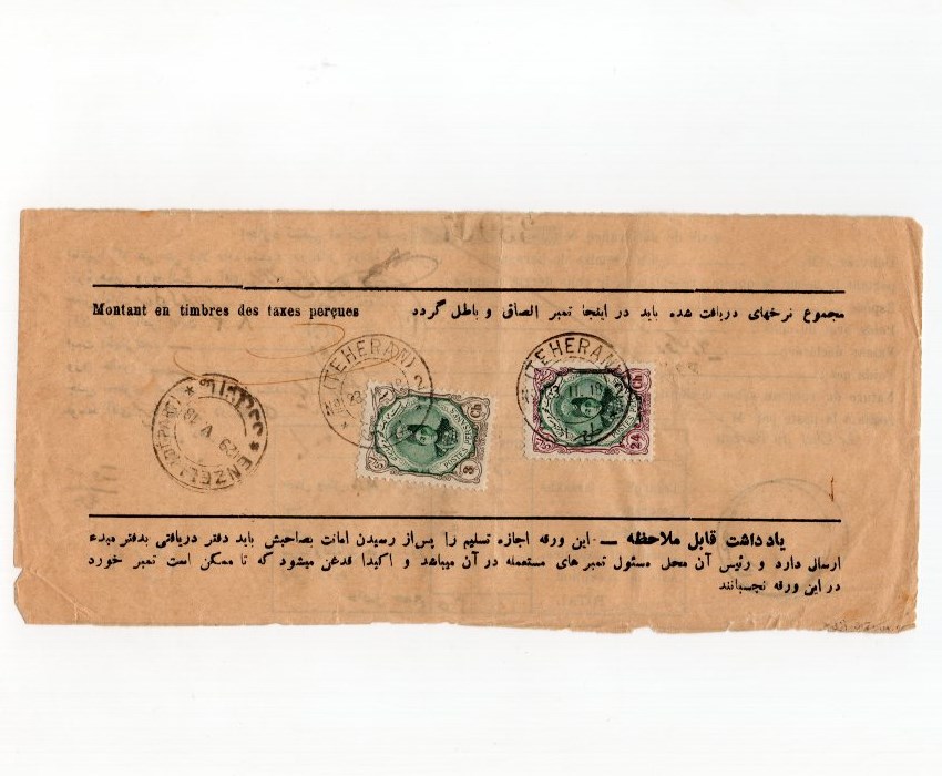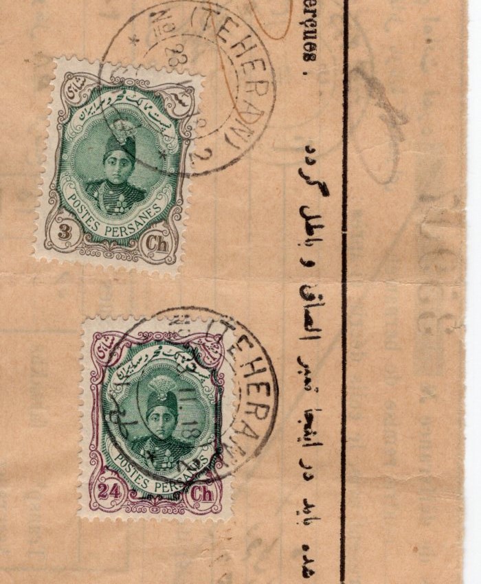 3ch, 24ch with small shifted center to the side Ahmad Shah Scott # 483, 492 on parcel delivery permit from Tehran to Enzeli via Recht.
