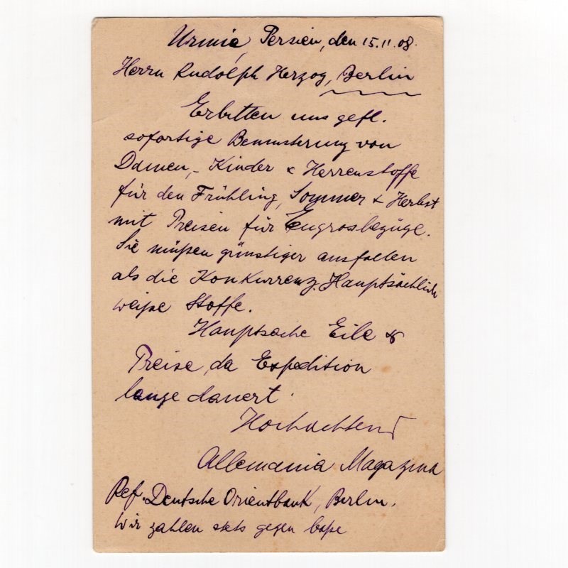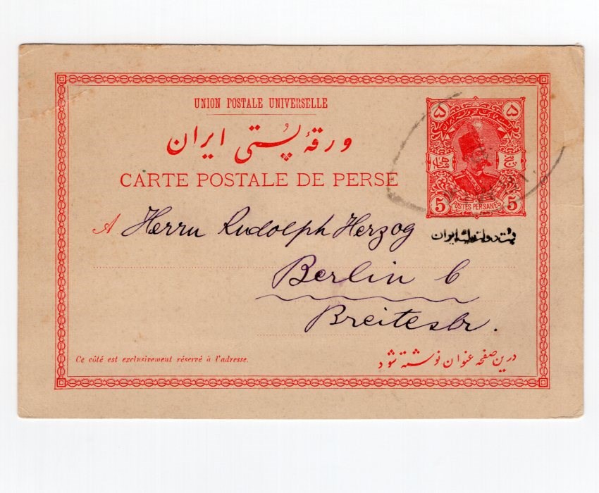 5ch red Muzaffer-Din Shah postal card with Imperial Post Iran overprint mailed from Uromia to Berlin with corner crease Paid only 5ch instead 6ch.