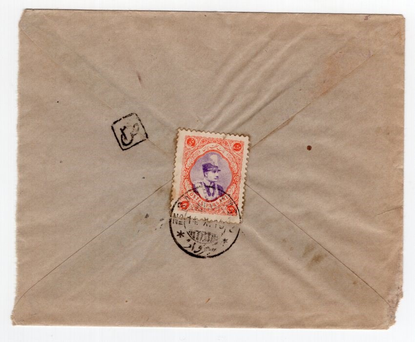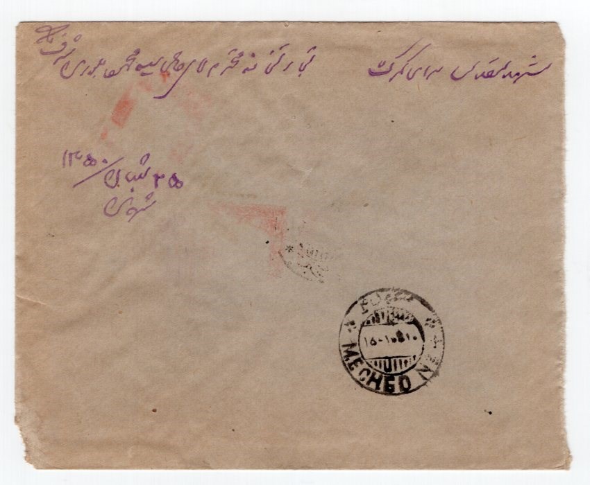Scott # 763 on cover from Sabzevar to Meched missing a corner with boxed " S2 " for sandooq mailbox marking.
