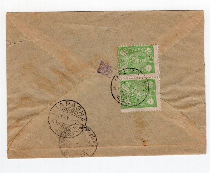 Misperfoarted pair 3ch Reza Shah redrawn Scott # 742 on a cover with tear on the side from Maragha to Tauris.