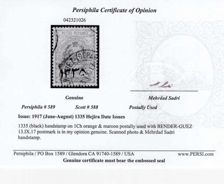 1ch coat of arms overprinted 1335 Scott # 588 postally used Scott value $250.00, Card Certification by Mr. Mehrdad Sadri.