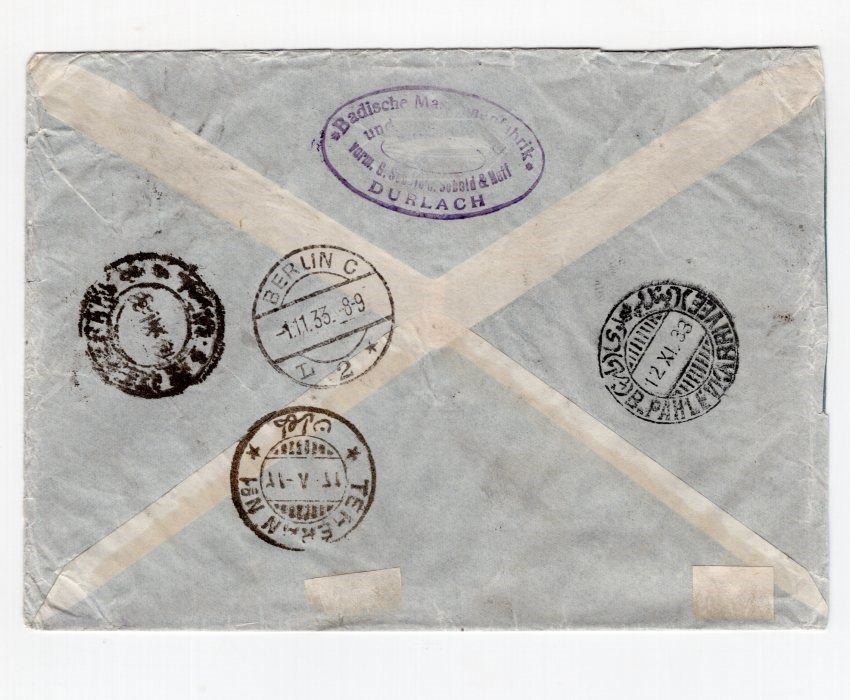 Perfin stamps single and pair on an airmail cover with corner fold from Durlach to Tehran via Berlin and Bender Pahlavi with boxed delivery time # 9.