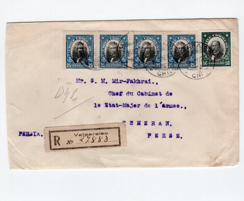 Scott # 106 strip four, 108 on registered cover from Valparaiso to Tehran address to Mirfakhrai minster of war.
