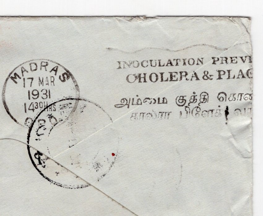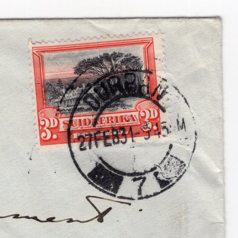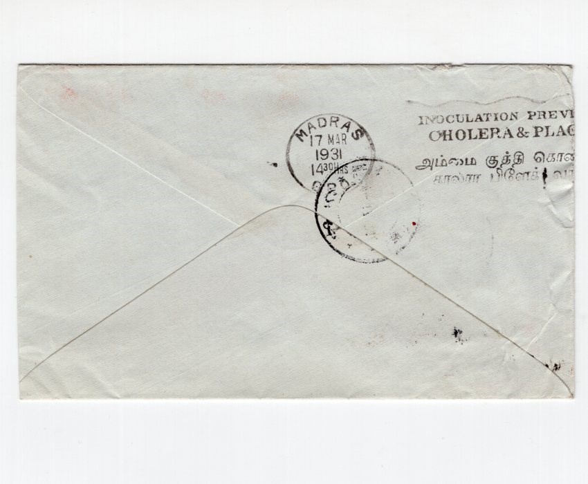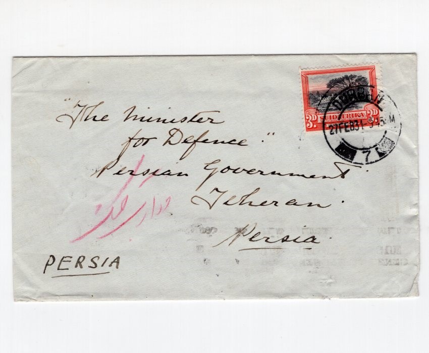 3d on cover from Durban to Tehran address to minister of war via Madras.