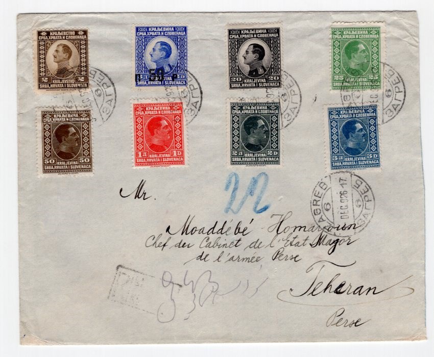 Eight different king Alexander on registered cover from Zagrab to Tehran address to Homayoun chief of staff of the army general staff.