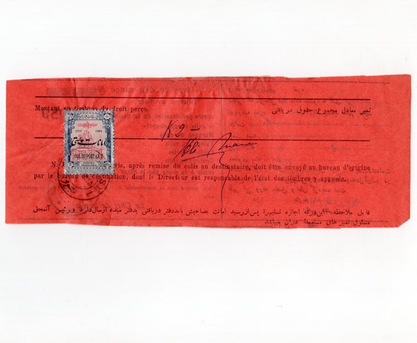 Single franking of 2kr Ahmad Shah coronation overprinted Colis Postaux Scott # Q29 on parcel delivery permit from Tauris to Tehran.
