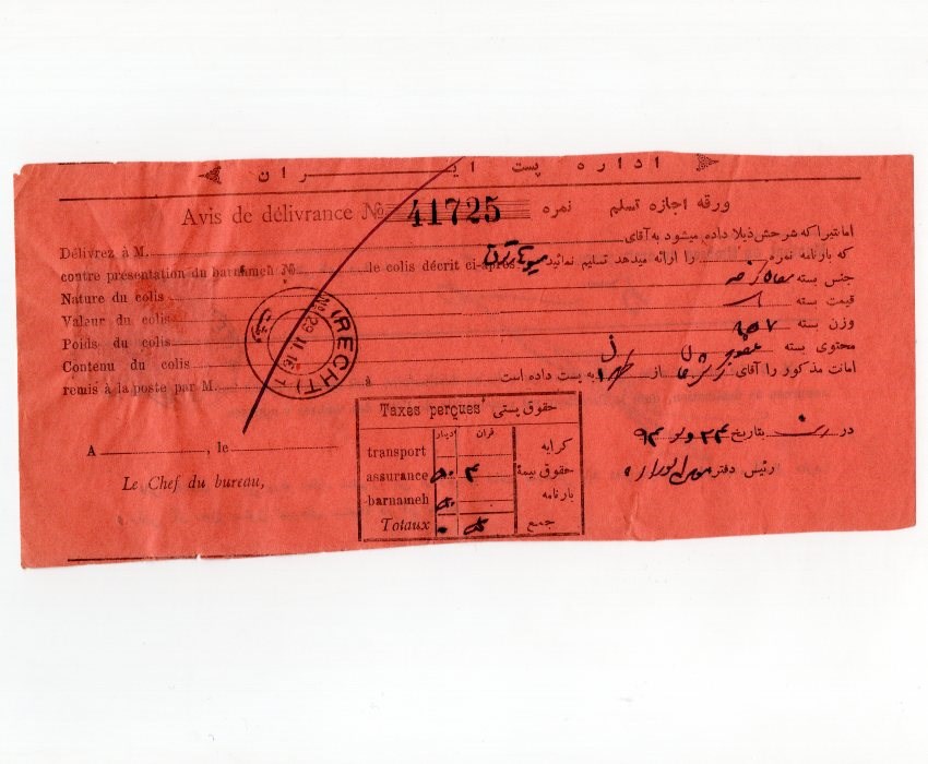 Single franking of 5kr Ahmad Shah coronation overprinted Colis Postaux Scott # Q31 on parcel delivery permit from Tehran to Recht.