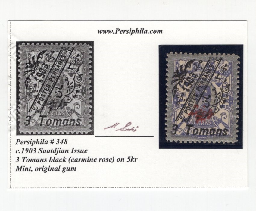3 Tomans Satdjian fancy surcharge on 5kr silver Persiphila # 348 mint hinged remnant, mini certified by Mr. Mehrdad Sadri.
