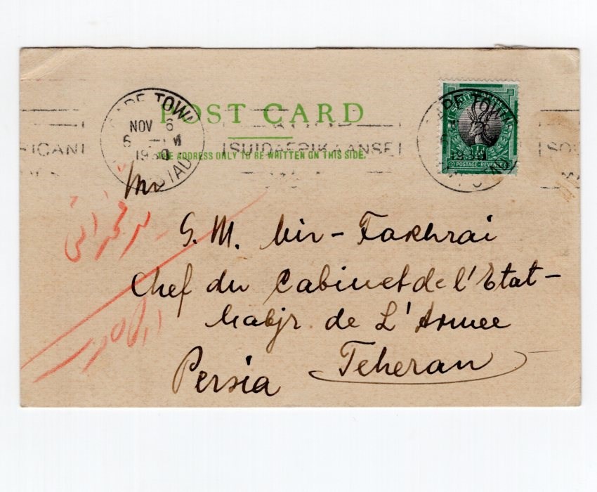 Postal card from Cape Town to Tehran with hinged remnant on the back.