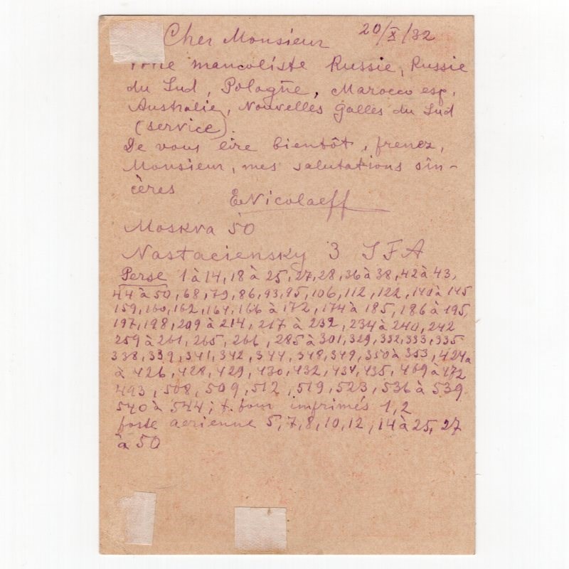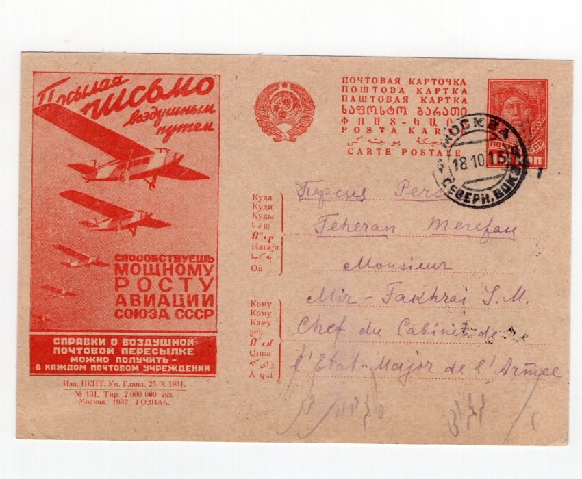 Cachet postal card with hinged remnant on the back from Moscow to Tehran.