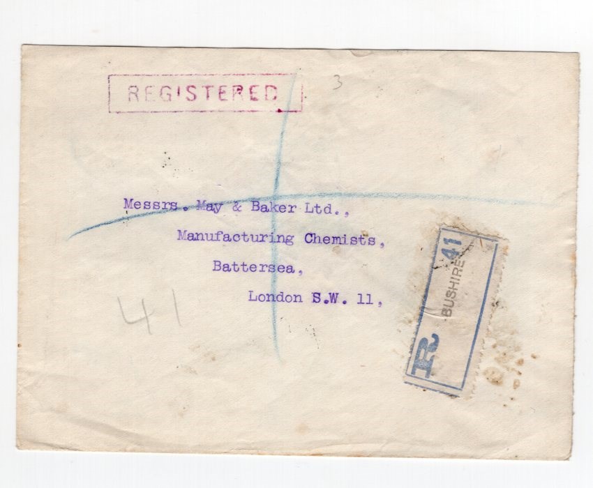 Late usage of Indian stamps in Bushire on a registered cover to London, cover opened from the top with Bushire registration label.