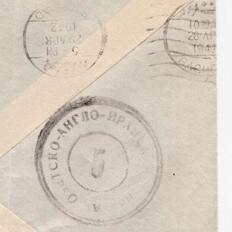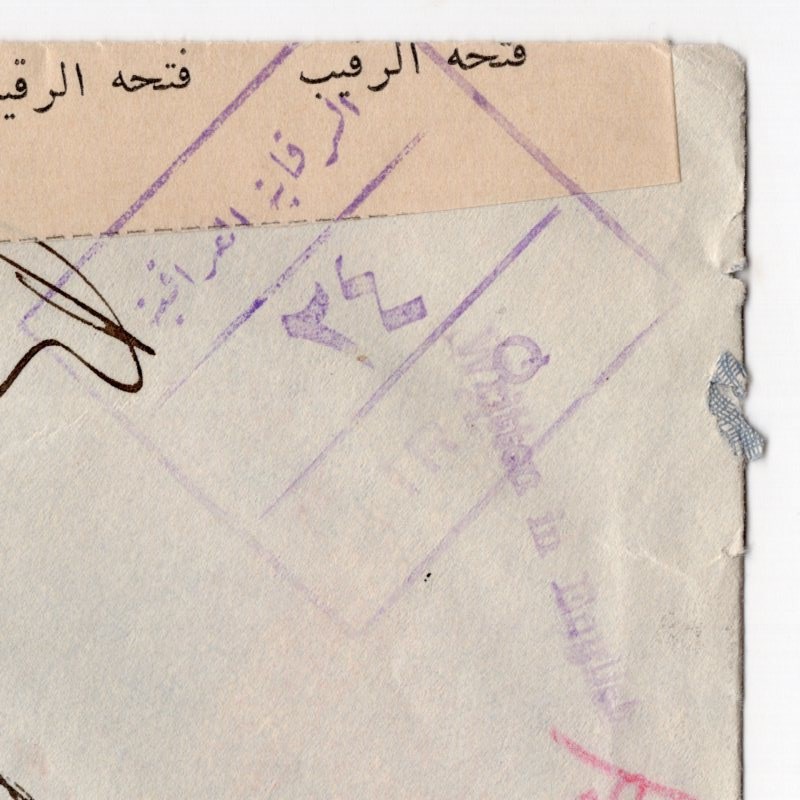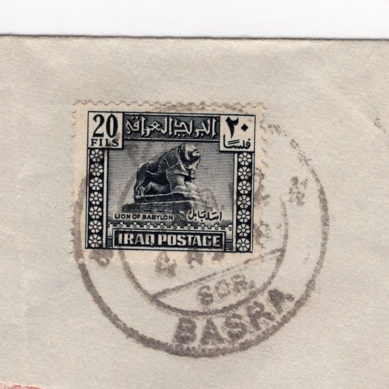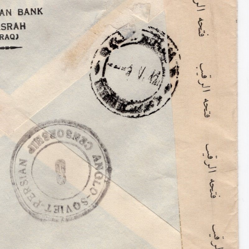 Ottoman bank cover with fold and tear on the back from Basra to Tehran via Baghdad with two different Anglo-Soviet-Persian censor and Iraqi censor with Arabic censor sealing label.