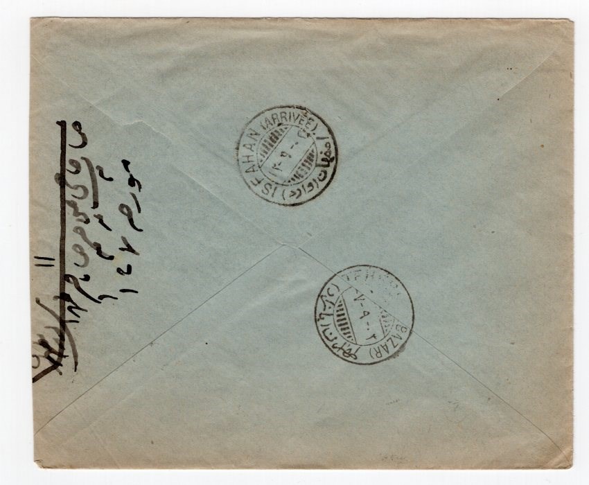 A prepaid cover with age discoloring from Tehran Bazar to Isfahan with boxed Keray Daryaft Shod Taxe Perque.