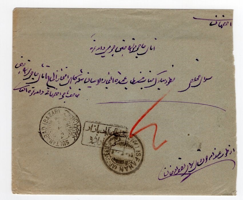 Pre paid cover from Sultan Abad Bazar to Isfahan with Sultan Abad Bazar Keray Ada Shod and original letter.