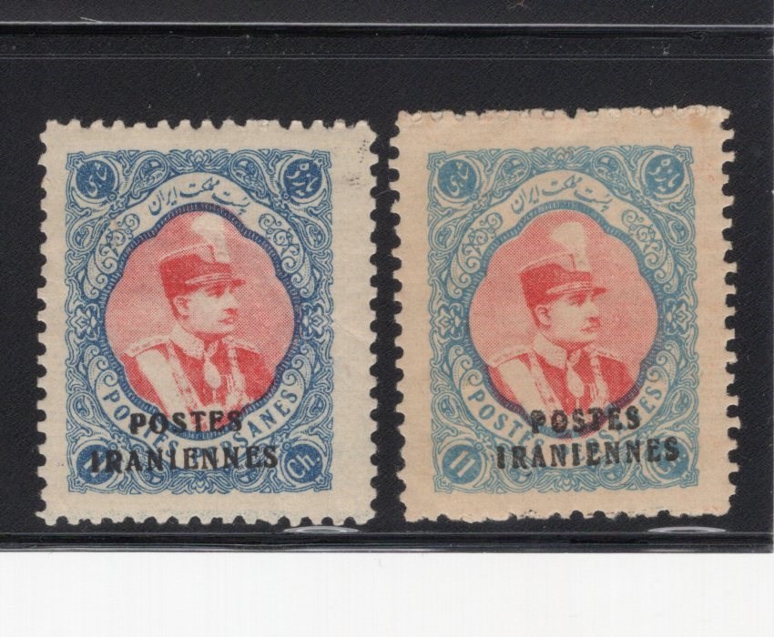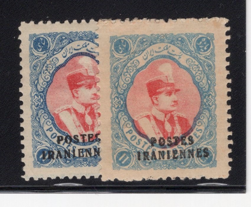 Two copies of 11ch in light and dark blue color overprinted Postes Iraninnes Scott # 823 mint lightly hinged.