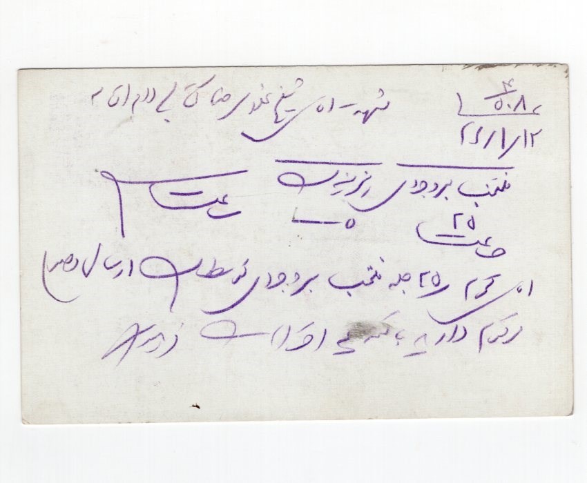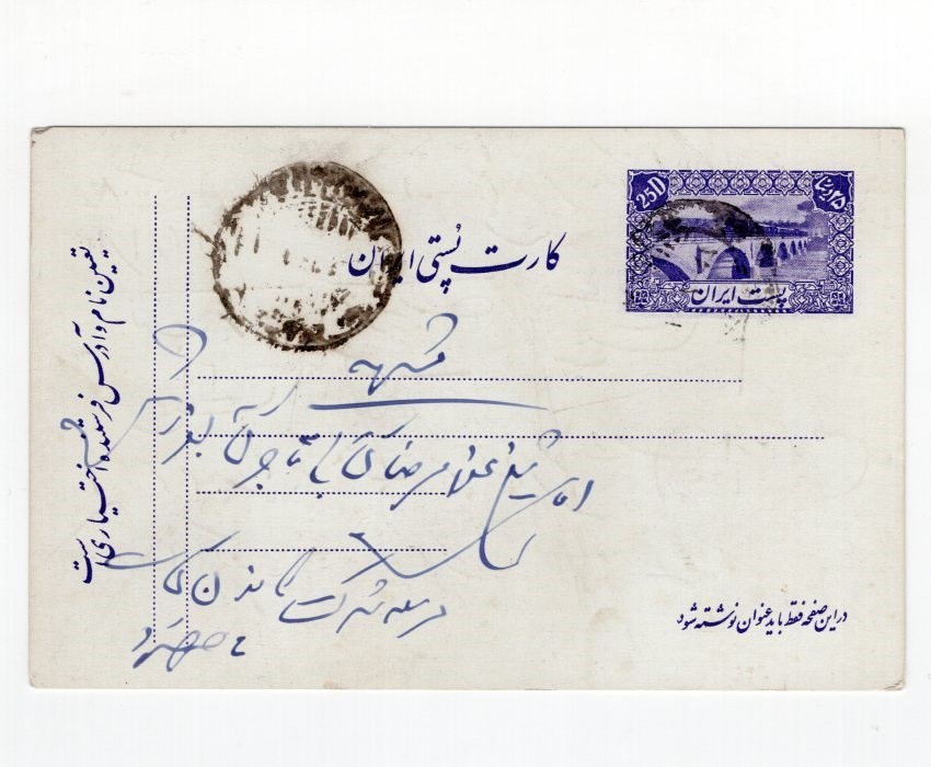 Two copies of 25 Dinar violet train on bridge postal card in two different color paper Persiphila # PC63A, B cream card on thin card and glazed white on thick card Persi value $65.00 with very small corner crease.