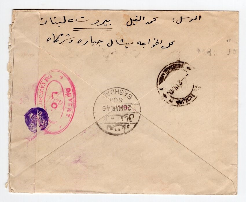 Scott #151 on cover from Beirut to Tehran via Baghdad with pink Ouvert L.O. French censor, nagative censor with post military censor label.