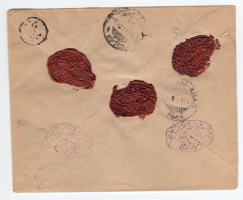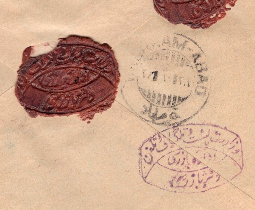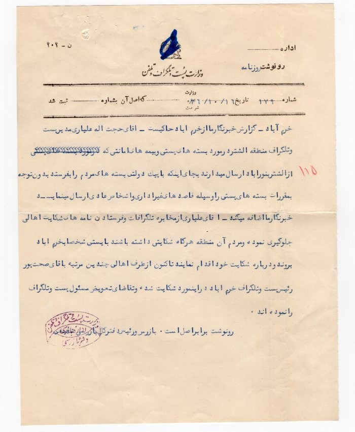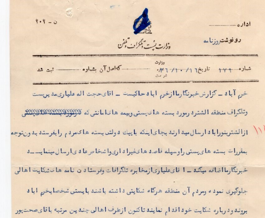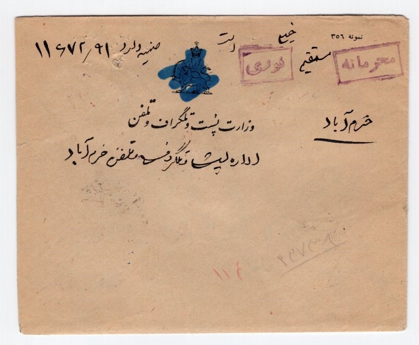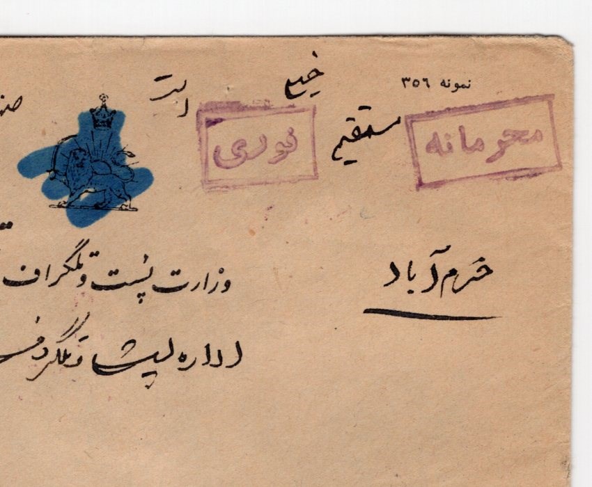 Confidential express free mail from Ministry of post cover and original letter from Tehran to Korram Abad with crown and lion obliterated?