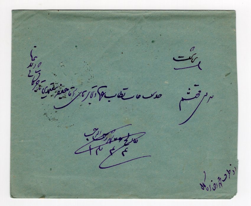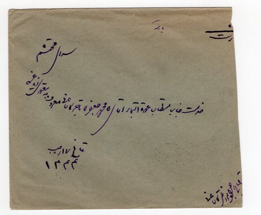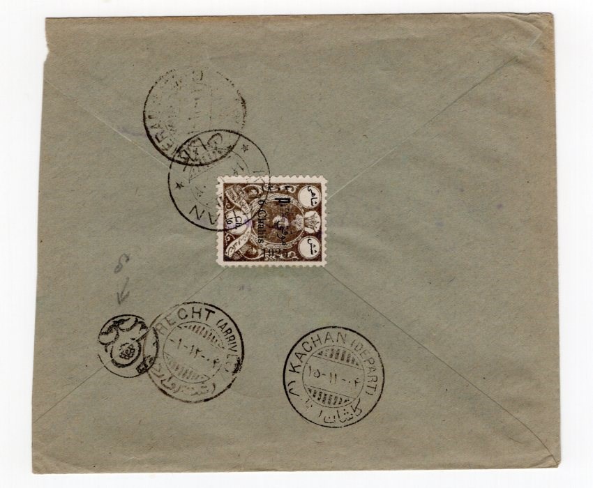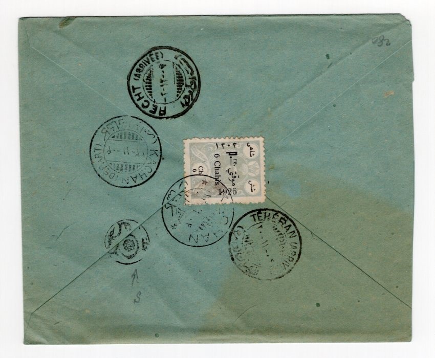 6ch chalky blue and one color changed Scott # 689 on two covers from Kachan to Recht via Tehran with fancy " S " for sandooq marking, normal color with original letter.